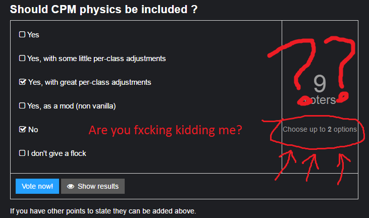 CPMA physics needs each class’s air acceleration factor to be heavily tweaked. IMO it’s fun and should stay - but ultimately I think we should also provide other ways to move fast that don’t involve jumping.