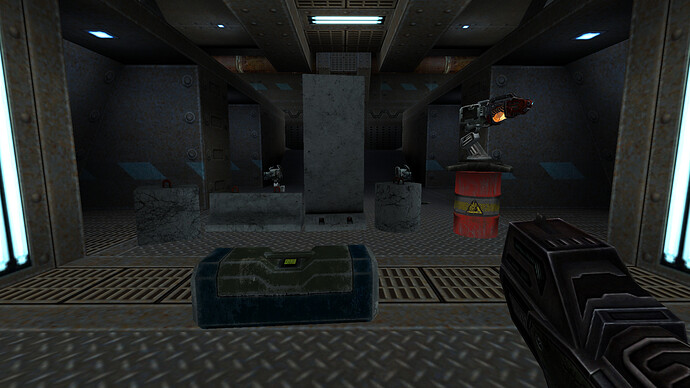 The human boxes are using textures from Trak which are all normal mapped. The alien blocks reuse the hovel skin which is just plain image without any special effect.