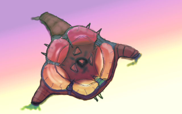 wormy tubes on the side suck into surface and ooze some stuff. slime filled sacs to shoot a slimey tongue out. some pointy teeth and a beak thingy await you at the middle. small claw things on the sides to help dig into a surface too… creep would also be underneath this