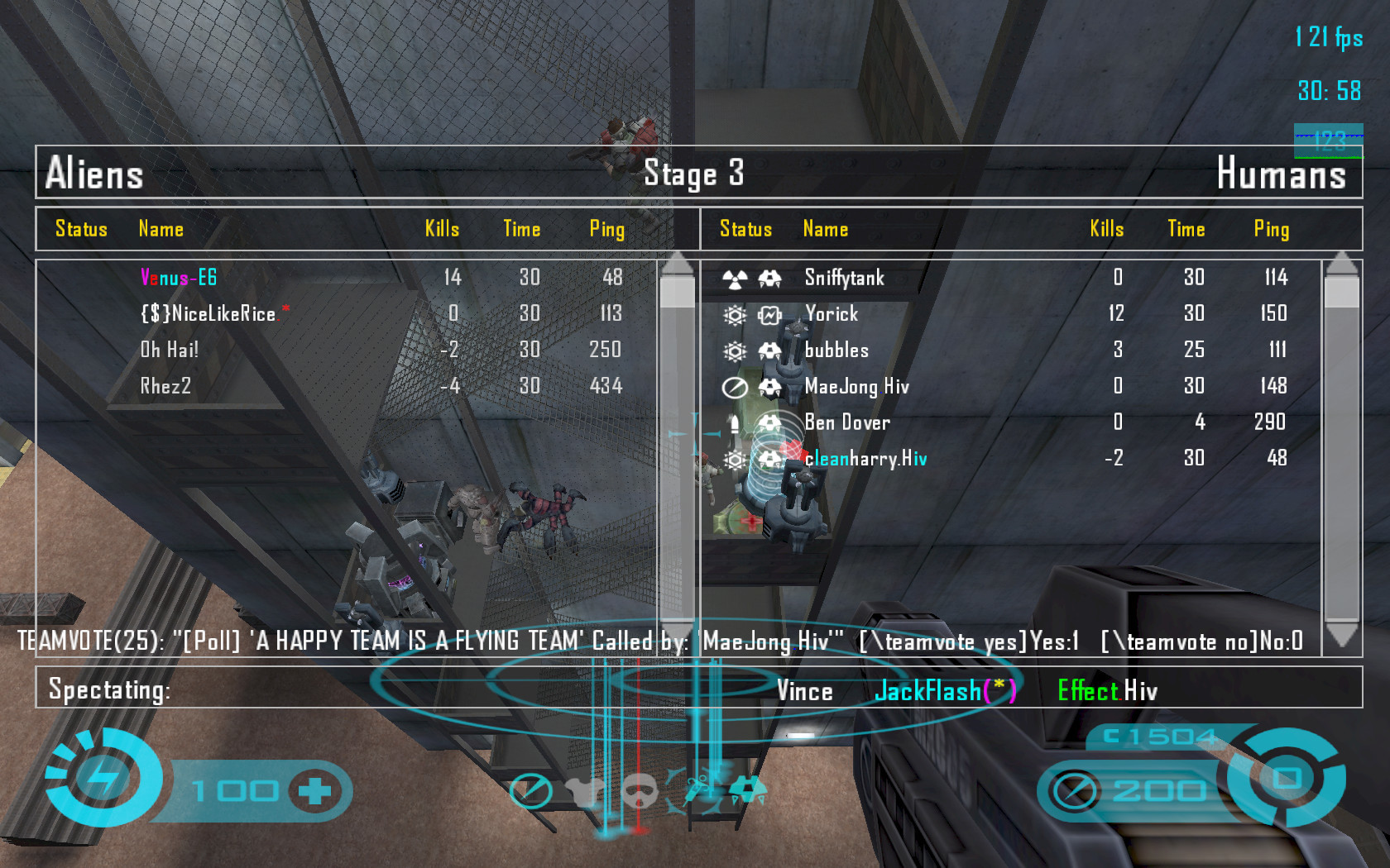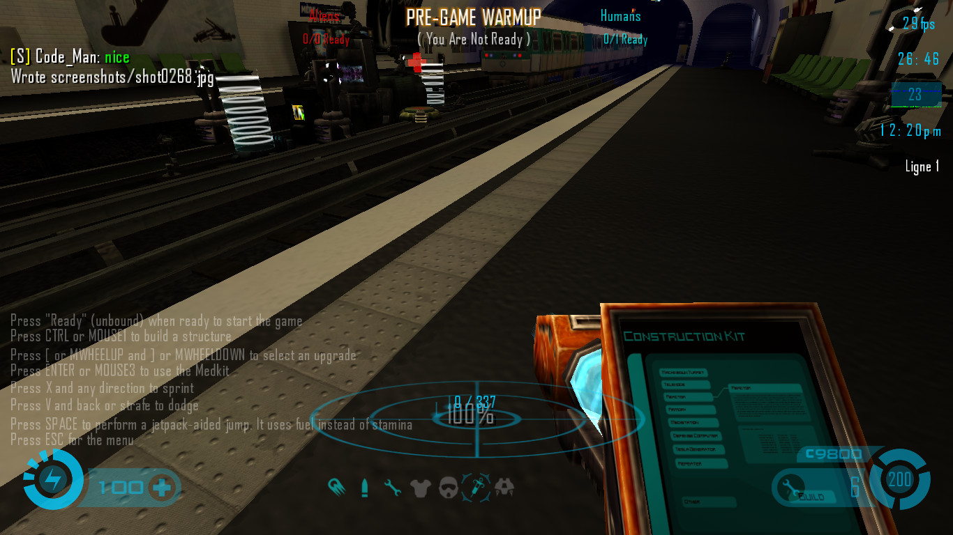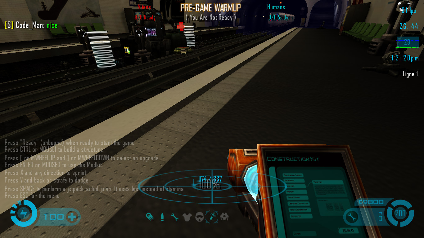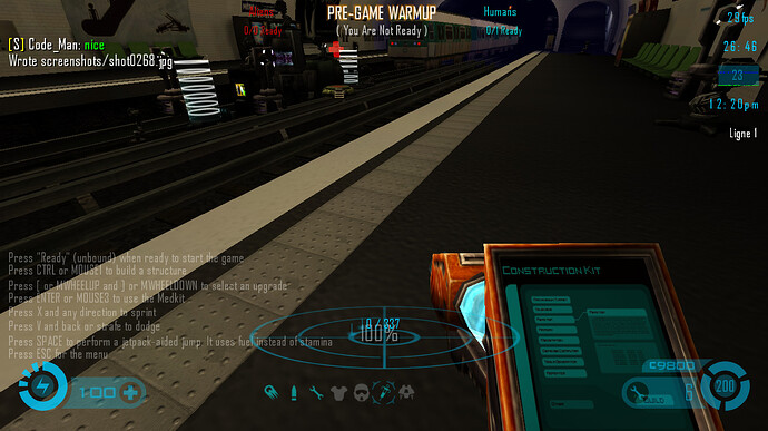 I decided to attempt to rebuild in the upper hall to the alien lookout. When I got to that location, all our nodes were down, I was the last human spawned, and we had about 120 seconds before life support would cut if the reactor core didn’t come back online. Thanks in large part to enemy radar/sense being disabled on the server, I had enough time to rebuild the rc, a telenode, the armoury, and a couple of rets before the aliens spotted us and we were able to defend enough to recover, build a good solid base at that location and then ultimately win the match.